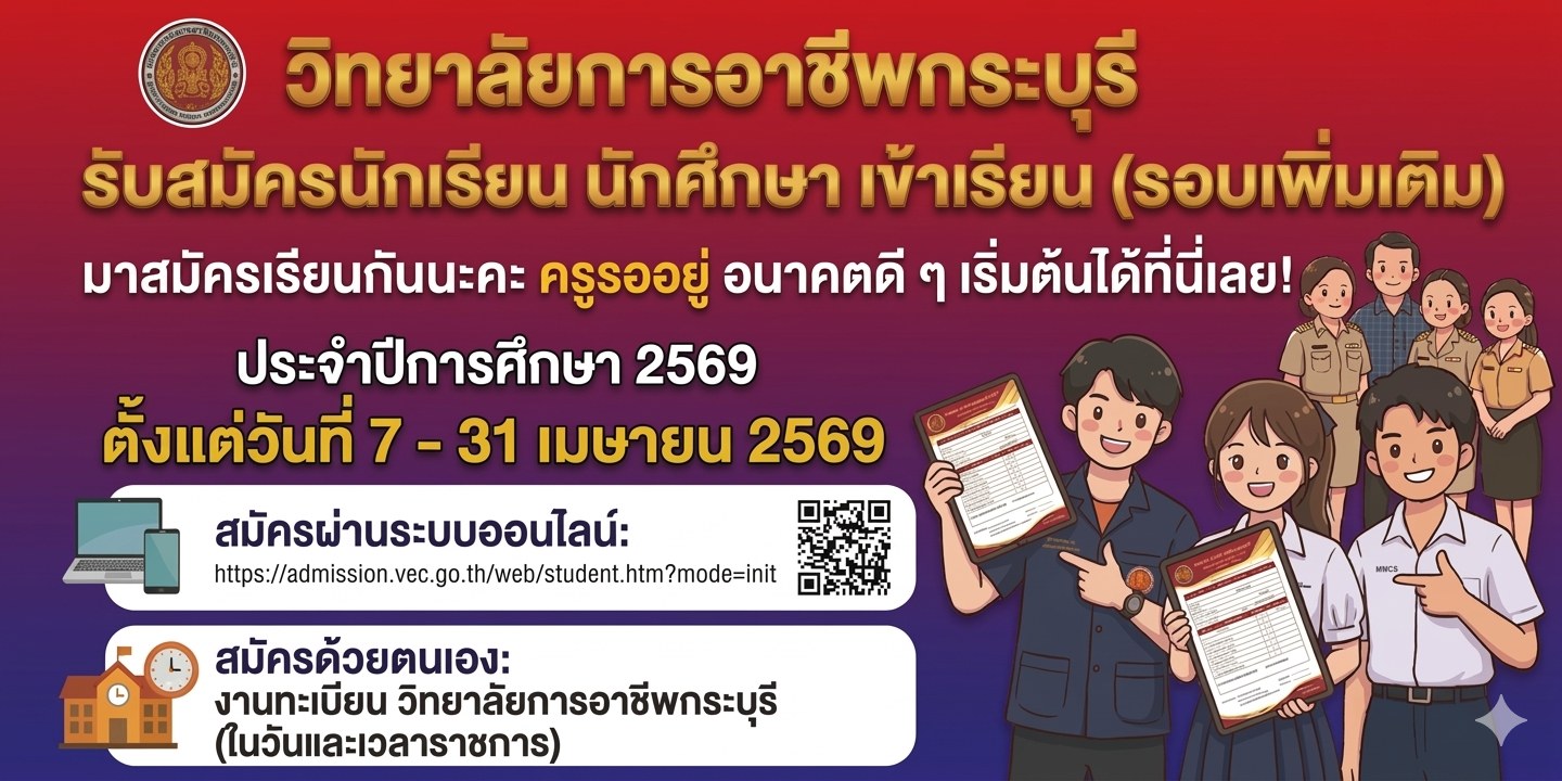 ประกาศวิทยาลัยการอาชีพกระบุรี เรื่อง การรับสมัครนักเรียน นักศึกษาเข้าเรียน (รอบเพิ่มเติม) ประจำปีการศึกษา 2568