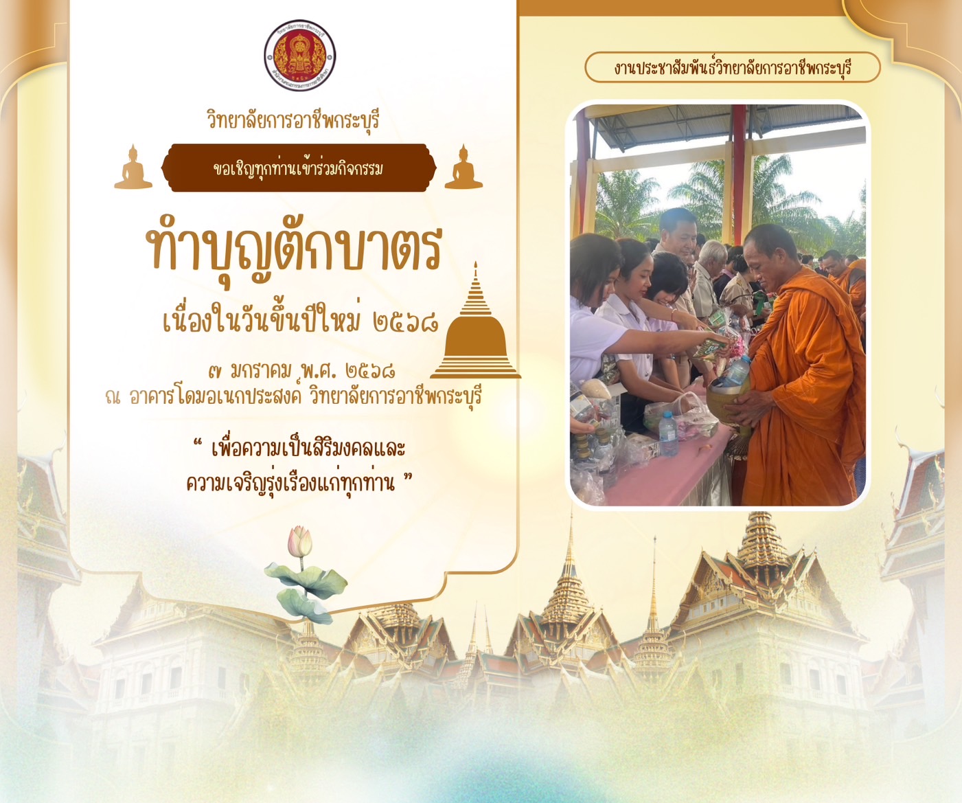 📣📣ขอเชิญชวน คณะผู้บริหาร คณะครู บุคลากรทางการศึกษาและนักเรียน นักศึกษา ร่วมกิจกรรมทำบุญตักบาตร เนื่องในวันขึ้นปีใหม่ 2568 ในวันที่ 7 มกราคม 2568 ณ อาคารอเนกประสงค์(โดม) วิทยาลัยการอาชีพกระบุรี