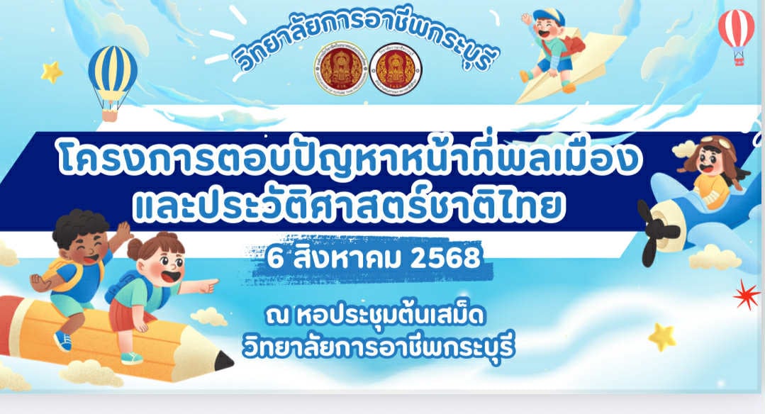 📣📣โครงการตอบปัญหาหน้าที่พลเมืองและประวัติศาสตร์ชาติไทย ในวันที่ 6 สิงหาคม 2568 ณ หอประชุมต้นเสม็ด วิทยาลัยการอาชีพกระบุรี