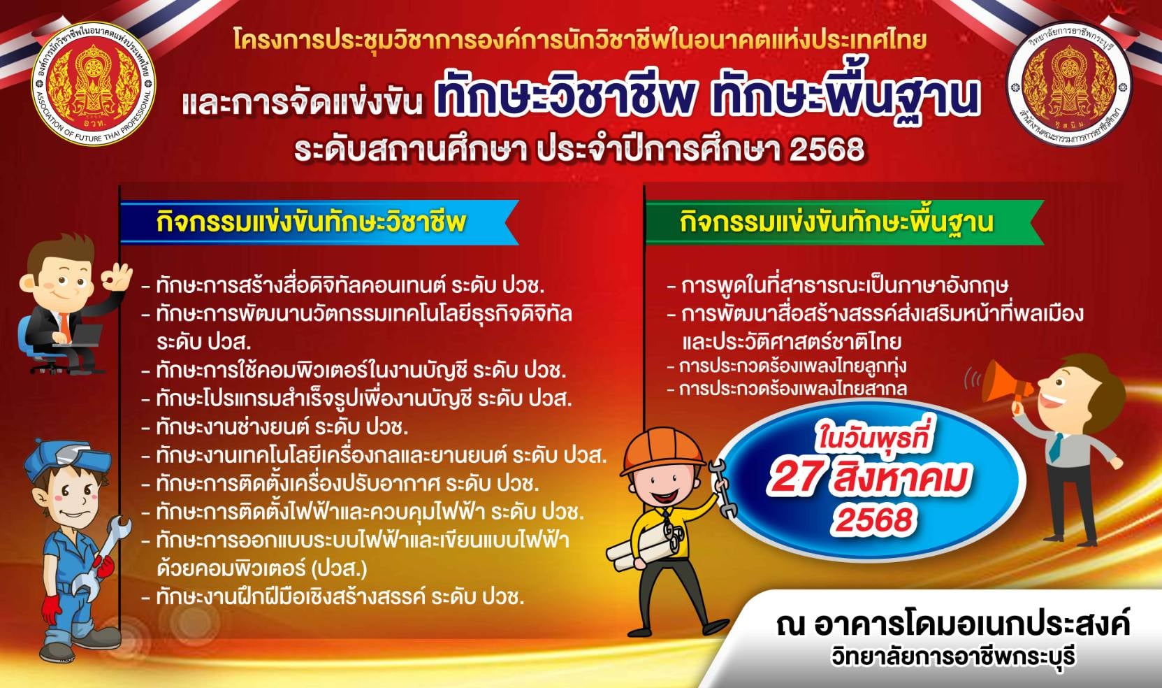 📣📣โครงการประชุมวิชาการองค์การนักวิชาชีพในอนาคตแห่งประเทศไทยและการจัดแข่งขันทักษะวิชาชีพ ทักษะพื้นฐาน ระดับสถานศึกษา ประจำปีการศึกษา 2568 ในวันที่ 27 สิงหาคม พ.ศ.2568 ณ อาคารโดมอเนกประสงค์ วิทยาลัยการอาชีพกระบุรี